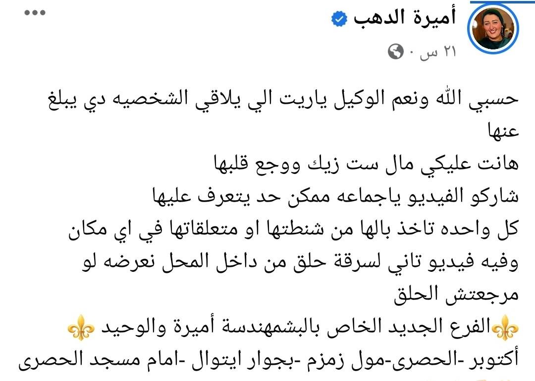 وطالبت أميرة الدهب من متابيعنها مشاركة المنشور لتحديد هوية تاسيدة والوصول ‘ليها، كما طالبت عملاءها بالانتباه الى حقائبهم، وأنها لديها فيديو آخر يرصد محاولته لسرةق حلق من المحل معلقة: لو مرجعتيش اللي سرقتيه هنشر الفيديو التاني.
