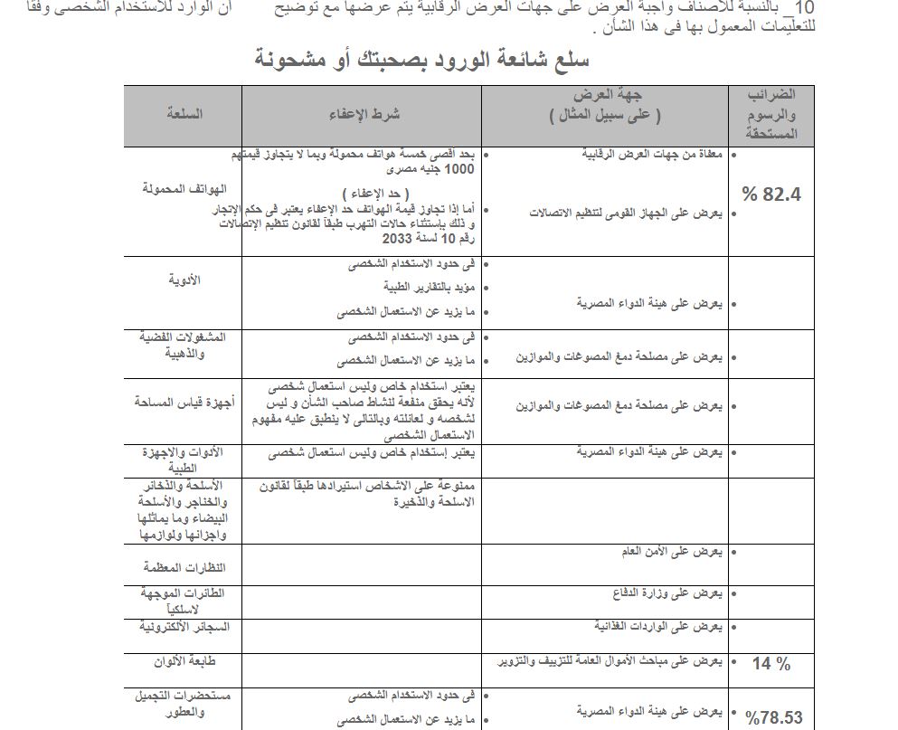أظهرت بيانات مصلحة الجمارك، أنه يمكن الإفراج عن المشغولات الذهبية التي تأتي مع المسافرين إلى مصر، سواء للمصريين القادمين من الخارج أو السائحين، للاستعمال الشخصي حتى كيلو جرام أو أكثر دون رسوم، أما ما يزيد عن الاستخدام الشخصي فيتم تحصيل رسوم وضرائب بنحو 82% من قيمته.