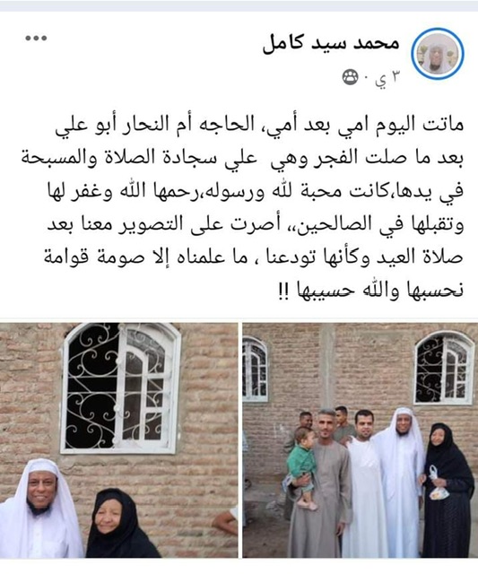 ويواصل الابن قائلا: طلبت في عيد الفطر التقاط صورة لها مع الشيخ محمد سيد كامل، وهو أحد الجيران، ويعمل بالخارج، قائلة له لعلها تكون الصورة الأخيرة وملحقش أشوفك بعدها، وقد كان.