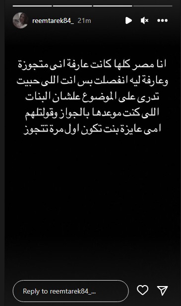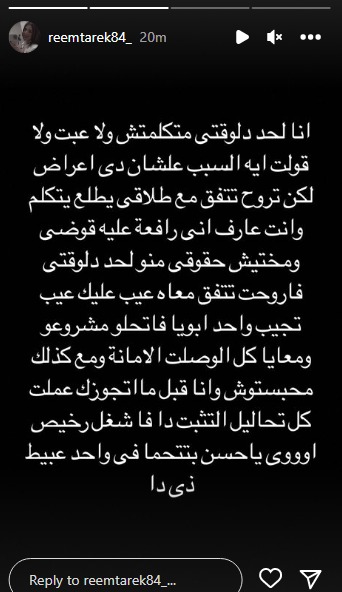 وأكدت ريم طارق زوجة حسن شاكوش، في منشور عبر ستوري حسابها الخاص بموقع إنستجرام، أن حسن شاكوش كان يعلم أنها كانت متزوجة قبله، ولكنه رفض أن يعلن ذلك على الملأ خوفًا من الفتيات اللاتي وعدهن بالزواج، حسب حديثها.
