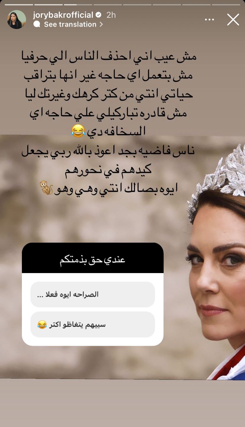 وكتبت جوري بكر، في منشور عبر خاصية ستورى على حسابها الشخصي بموقع تبادل الصور والفيديوهات انستجرام، وقالت: مش عيب إني أحذف الناس اللي مش بتعمل أي حاجة غير إنها بتراقب حياتي، إنتي من كتر كرهك وغيرتك ليا مش قادرة تباركيلي على حاجة إيه السخافة دي، ناس فاضية بجد أعوذ بالله ربي يجعل كيدهم في نحورهم.