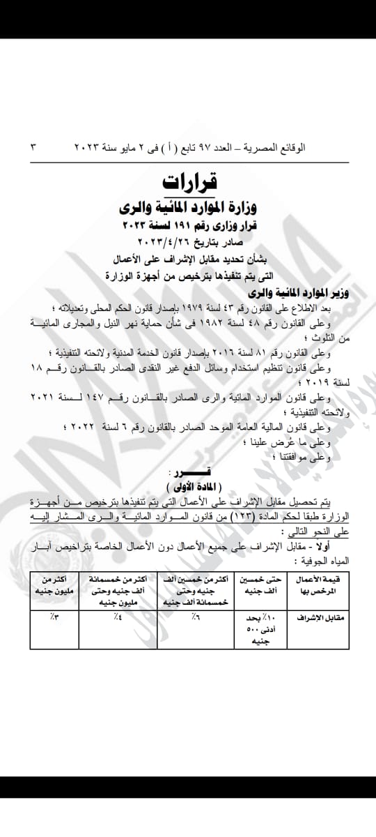 نشرت الجريدة الرسمية قرار هاني سويلم وزير الموارد المائية والري، رقم 191 لعام 2023، بشأن تحديد مقابل الإشراف على الأعمال التي يتم تنفيذها بترخيص من أجهزة الوزارة.