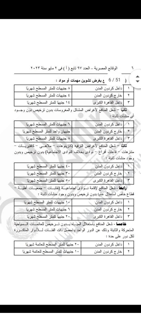 يتم تحصيل مقابل الانتفاع عن شغل استغلال الأملاك العامة ذات الصلة بالموارد المائية والري دون ترخيص على المجاري المائية وذلك لحين الإزالة وإعادة الشيء إلى أصله، وفقا لحكم المادة (119) من قانون الموارد المائية والري.