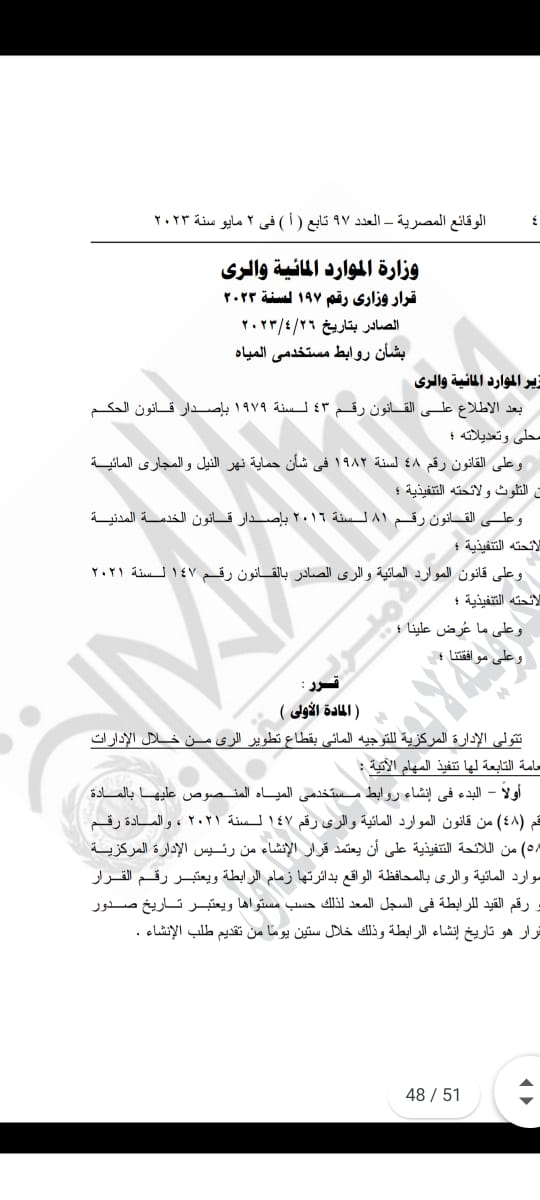 كما جاء في نص قرار وزير الموارد المائية والري: بعد الاطلاع على القانون بإصدار قانون الحكم المحلى وتعديلاته؛ وعلى القانون رقم 48 لسنة 1982 في شأن حماية نهر النيل والمجاري المائية من التلوث، وعلى قانون رقم 81 لسنة 2016 بإصدار قانون الخدمة المدنية ولائحته التنفيذية؛ قانون تنظيم استخدام وسائل الدفع غير النقدي الصادر بالقانون رقم 18لسنة 2019.