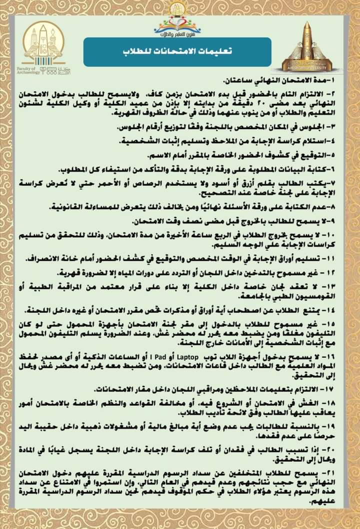 توجيهات مهمة من كلية الآثار جامعة عين شمس للطلاب بشأن امتحانات الترم الثاني