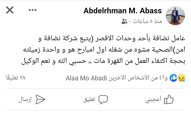 منشور يطالب بحق عامل مات قهرا لفصله من العمل