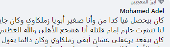 وانهالت التعليقات الساخرة على فيديو الطفل، وقال حساب باسم محمد: كان بيحصل فيا كدا من وأنا صغير أبويا زملكاوي وكان جايب ليا تيشرت حازم إمام قلتله أنا هشجع الأهلى، والله العظيم كان بيقعد يزعقلي عشان أبقى زملكاوي.