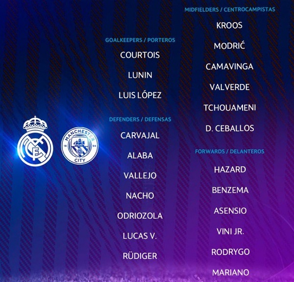 - خط الدفاع: دانيال كارفاخال - دافيد ألابا - روديجر - إدوارد كامافينجا.