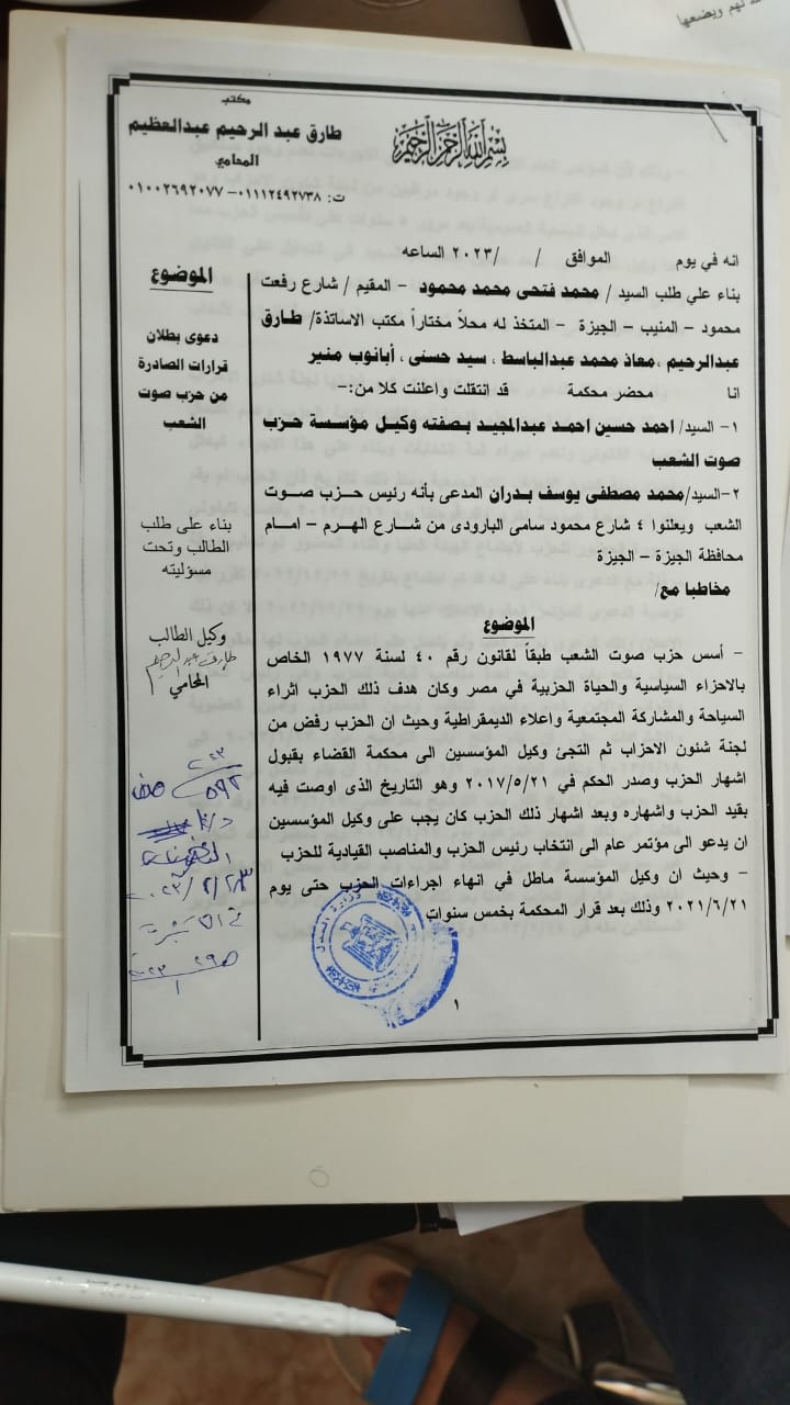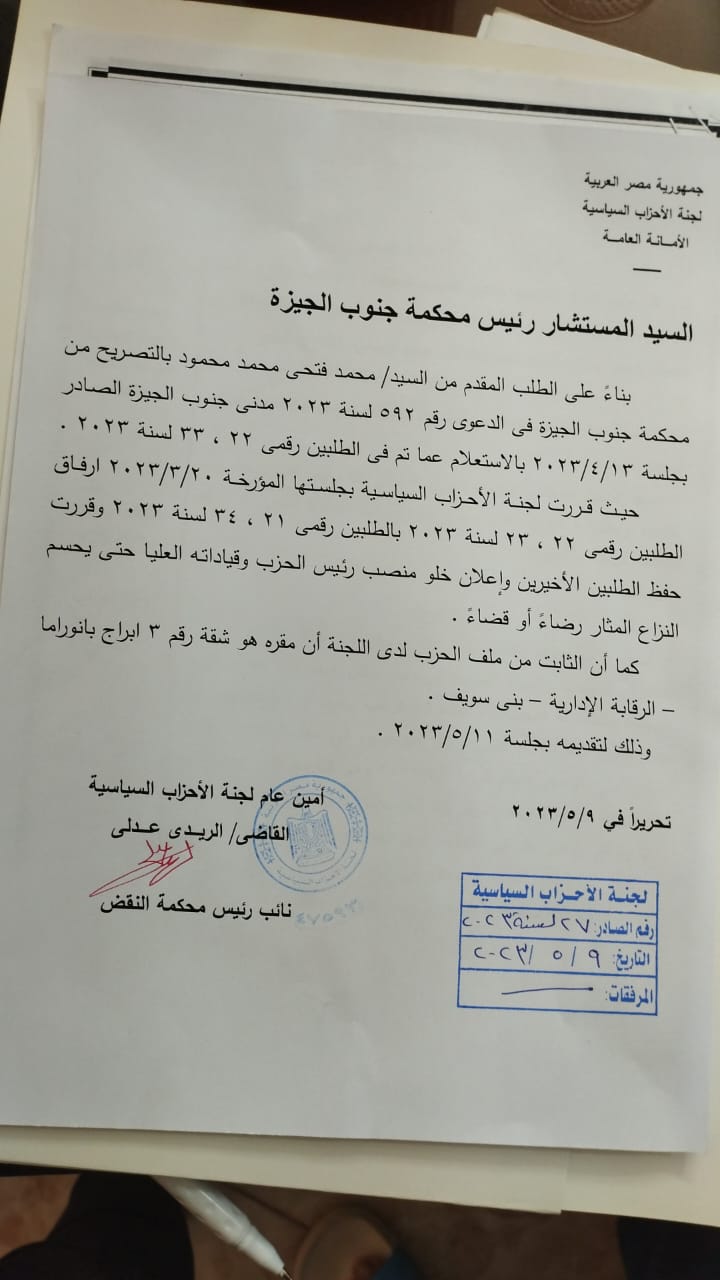 وقالت اللجنة ردًا على الطلب المقدم من محمد فتحي محمد، نائب رئيس الحزب لشؤون الإعلام والمتحدث الرسمي، إنها قضت في جلستها التي عقدت في 20/3/2023، بخلو منصب رئيس الحزب وقيادته العليا لحين الفص في النزاع، مؤكدًا أنه سيتم إعلان التفاصيل خلال الساعات المقبلة في مؤتمر صحفي.
