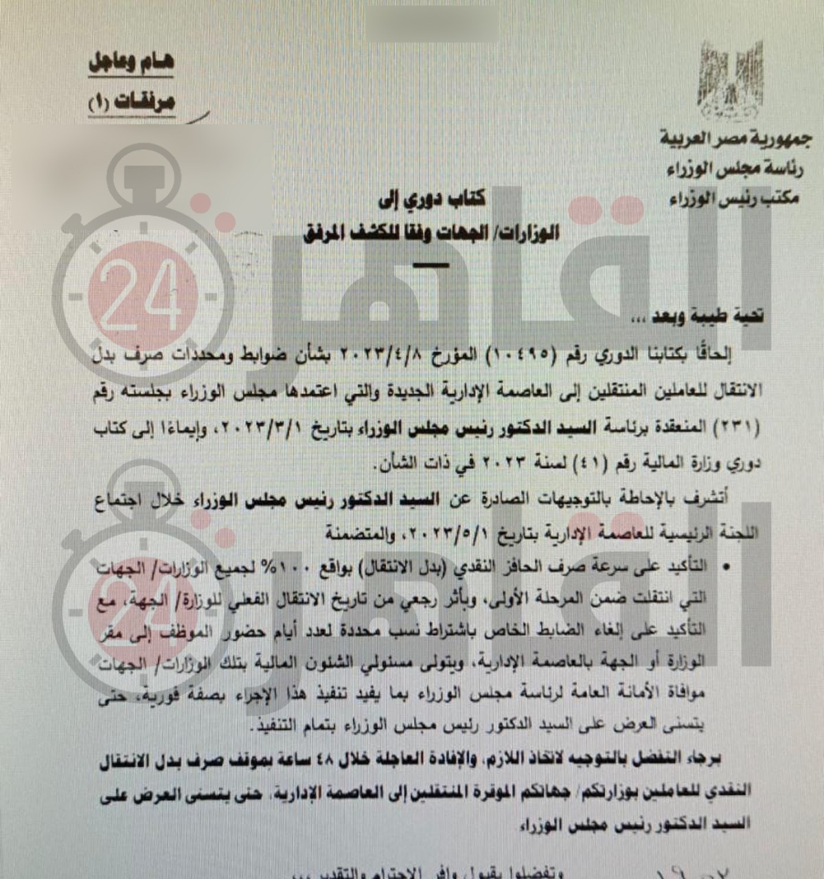 وجاء بالمستند: برجاء التفضل بالتوجيه لاتخاذ اللازم، والإفادة العاجلة خلال 48 ساعة بموقف صرف بدل الانتقال النقدي للعاملين بوزارتكم وجهاتكم الموقرة المنتقلين إلى العاصمة الإدارية، حتى يتسنى العرض على الدكتور مصطفى مدبولي رئيس مجلس الوزراء.