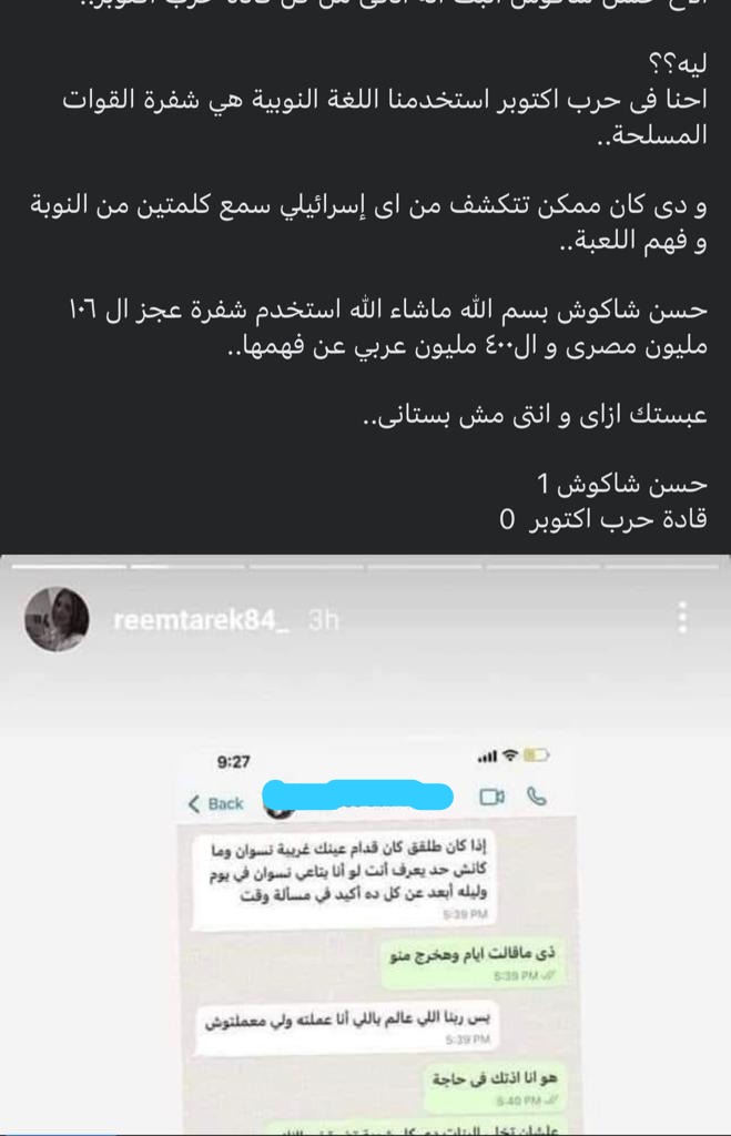 انتشر على مواقع التواصل الاجتماعي شات سكرين شوت بين حسن شاكوش وزوجته ريم طارق، وظهر خلال المحادثة بينهما العديد من الأخطاء اللغوية، التي أثارت حالة من الجدل الكبير بين رواد مواقع التواصل الاجتماعي، وتتصدر التريند منذ أمس.