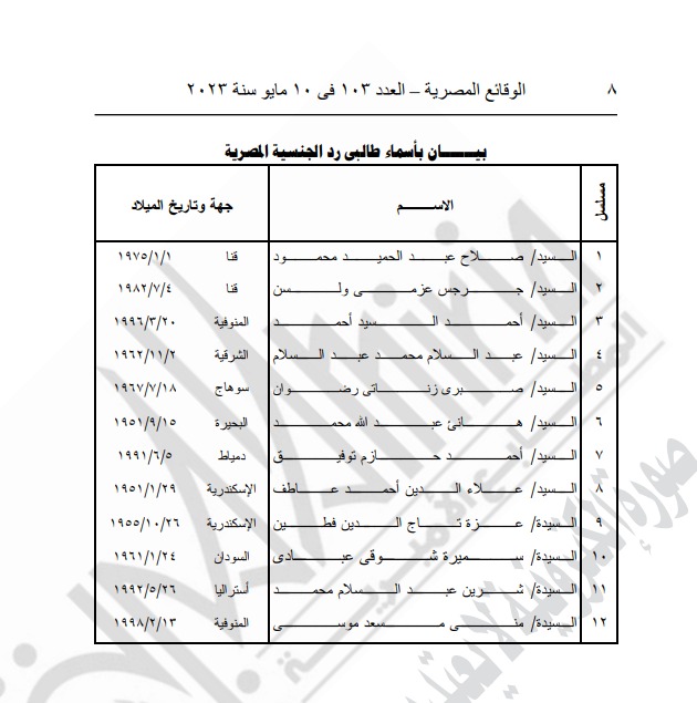 ونشرت الجريدة الرسمية اليوم الأربعاء قرار وزير الداخلية: ترد الجنسية المصرية لكل من الاثنى عشر شخصا المدرجة أسماؤهم بالبيان المرفق أولهم صلاح عبد الحميد محمود - وآخرهم منى مسعد موسى.
