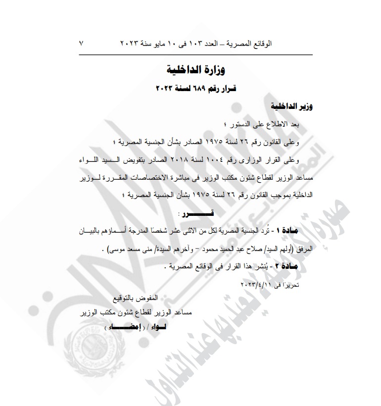 في سياق منفصل أصدر وزير الداخلية القرار رقم 538 لسنة 2023 بعد الاطلاع على الدستور، وعلى القانون رقم 26 لسنة 1975 الصادر بشأن الجنسية المصرية، وعلى القرار الوزاري رقم 1004 لسنة 2018 الصادر بتفويض اللواء مساعد الوزير لقطاع شئون مكتب الوزير فى مباشرة الاختصاصات المقررة لوزير الداخلية بموجب القانون رقم 26 لسنة 1975 بشأن الجنسية المصرية، يُؤذن لـ 21 شخصًا بالتجنس بالجنسية الأجنبية.