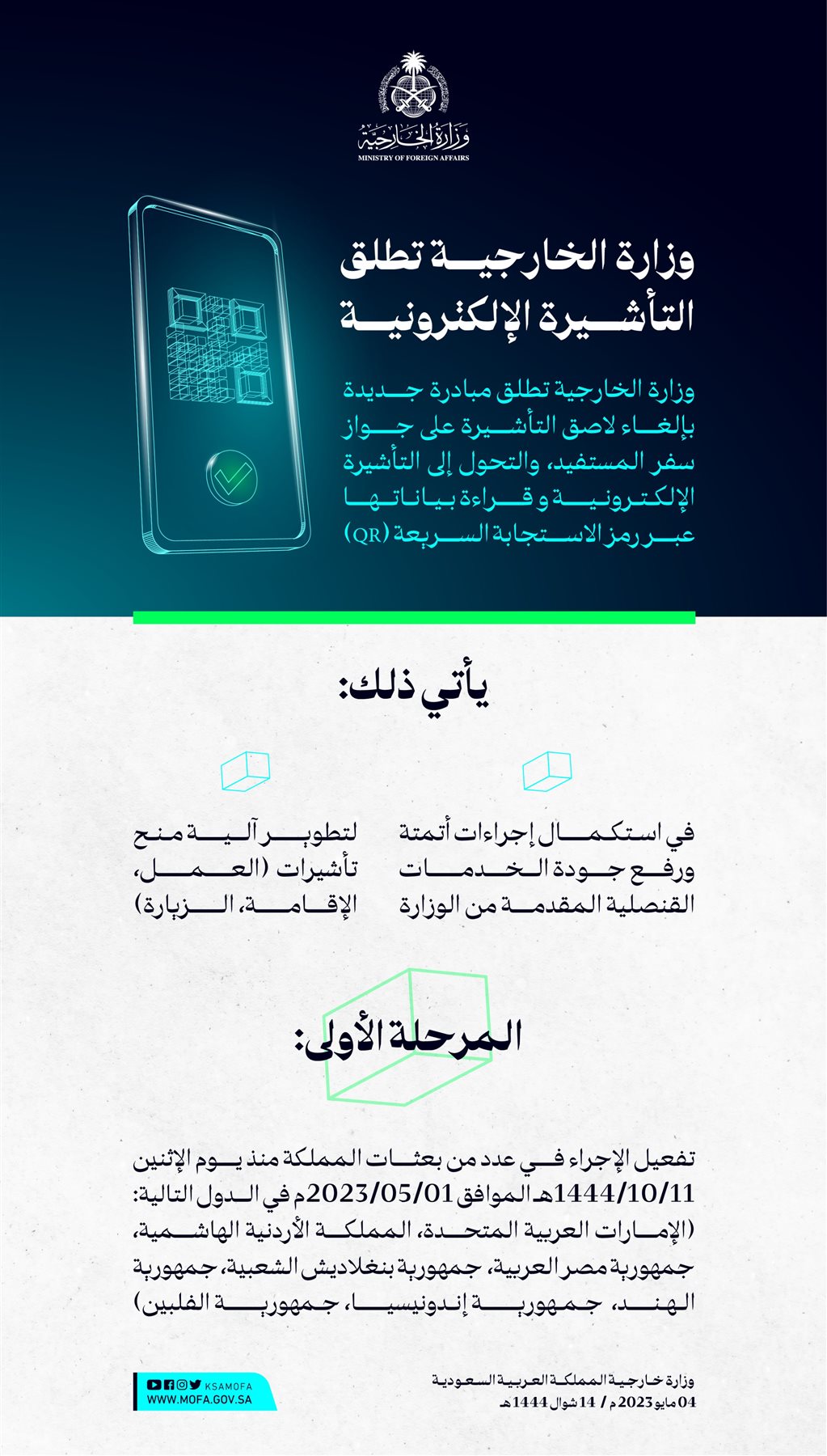 وكانت وزارة الخارجية السعودية أعلنت في وقت سابق، إلغاء لاصق التأشيرة على جواز سفر المستفيد والتحول إلى التأشيرة الإلكترونية وقراءة بياناتها عبر رمز الاستجابة السريعة (QR).