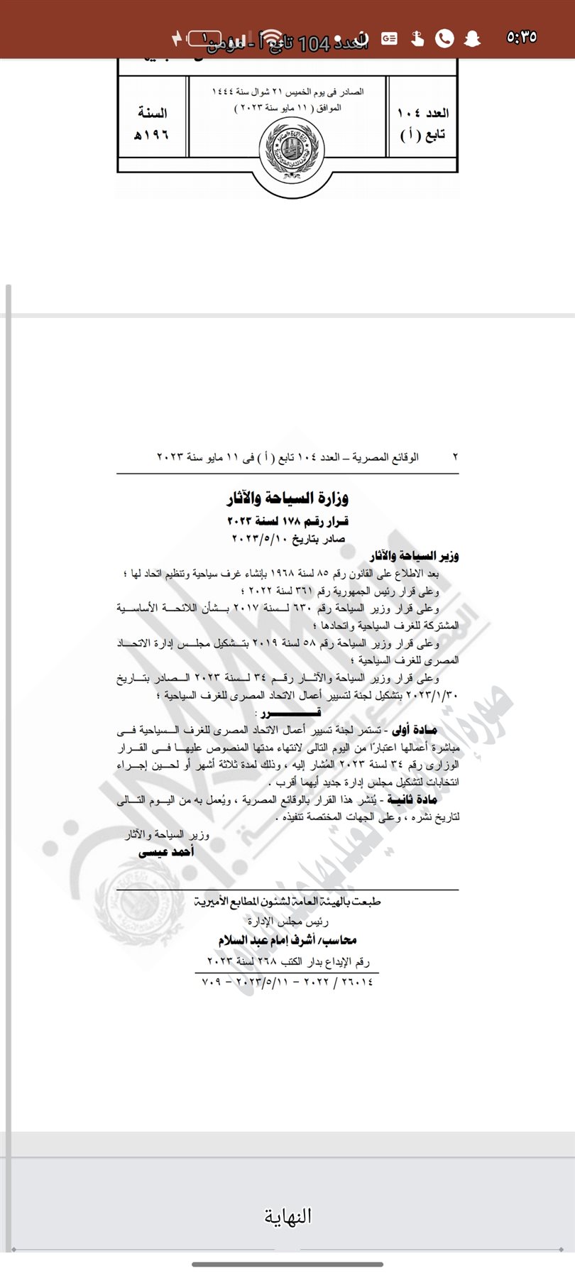 وقالت الجريدة الرسمية: إنه بعد الاطلاع على القانون رقم 85 لسنة 1968 بإنشاء غرف سياحية وتنظيم اتحاد لها، وعلى قرار رئيس الجمهورية رقم 361 لسنة 2022 وعلى قرار وزير السياحة رقم 630 لسنة 2017 بشأن اللائحة الأساسية المشتركة للغرف السياحية واتحادها، وعلى قرار وزير السياحة رقم 58 لسنة 2019 بتشكيل مجلس إدارة الاتحاد المصري للغرف السياحية، وعلى قرار وزير السياحة والآثار رقم 34 لسنة 2023 الصادر بتاريخ 30/ 1/ 2023، بتشكيل لجنة لتسيير أعمال الاتحاد المصري للغرف السياحية، موضحة أن المادة الأولى لقرارها هو أن تستمر لجنة تسيير أعمال الاتحاد المصري للغرف السياحية في مباشرة أعمالها اعتبارا من اليوم التالي لانتهاء مدتها المنصوص عليها في القرار الوزاري رقم 34 لسنة 2023 المشار إليه، وذلك لمدة ثلاثة أشهر أو لحين إجراء انتخابات لتشكيل مجلس إدارة جديد أيهما أقرب.