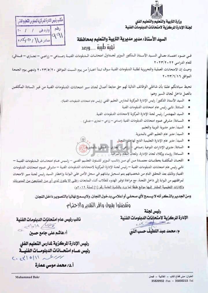 جاء ذلك في ضوء اعتماد الدكتور رضا حجازي، وزير التربية والتعليم والتعليم الفني، جداول امتحانات الدبلومات الفنية (ناعي - زراعي - تجاري - فندقي للعام الدراسي 2023، حيث تبدأ الامتحانات العملية والتحريرية لطلبة الدبلومات الفنية اعتبارًا من يوم السبت الموافق 20 مايو 2023، فإن شاغلي الوظائف التالية لهم حق متابعة أعمال لجان سير امتحانات الدبلومات الفنية من غير المكلفين بالعمل داخل لجان السير وهم: