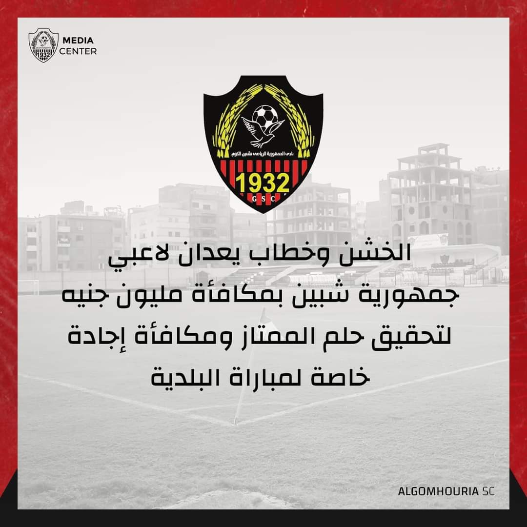 ووعد الخشن وخطاب لاعبي جمهورية شبين بمكافأة مليون جنيه لتحقيق حلم الممتاز، ومكافأة إجادة خاصة لمباراة بلدية المحلة، ونشرت الصفحة الرسمية للفريق بيانا، وجاء كالتالي: