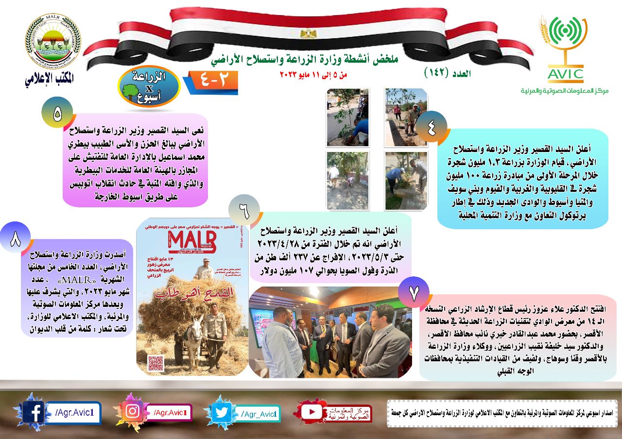 وخلال هذا الأسبوع أعلن وزير الزراعة، أنه تم خلال الفترة من 28/4/2023 حتى 3/5/2023، الإفراج عن 237 ألف طن من الذرة وفول الصويا بحوالي 107 ملايين دولار، كما افتتح الدكتور علاء عزوز رئيس قطاع الإرشاد الزراعي النسخة الـ 14 من معرض الوادي لتقنيات الزراعة الحديثة في محافظة الأقصر، بحضور محمد عبدالقادر خيري نائب محافظ الأقصر، والدكتور سيد خليفة نقيب الزراعيين، ووكلاء وزارة الزراعة بالأقصر وقنا وسوهاج، ولفيف من القيادات التنفيذية بمحافظات الوجه القبلي.