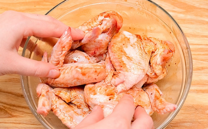 - وعن الخطوة الثالثة يتم وضع التتبيلة على أجنحة الدجاج لمدة لا تقل عن 90 دقيقة.