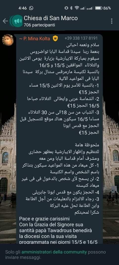 وتداول مستخدمو مواقع التواصل الاجتماعي فيسبوك، منشورات لقساوسة في روما داخل مجموعات الإيباريشيات الإيطالية من خلال تطبيق واتس آب، تفيد بضرورة حجز الأقباط داخل الإيباربشية تذكرة بمبلغ مالي يقدر بـ15 يورو، من أجل دخول الكنيسة ولقاء قداسة البابا تواضروس الثاني.
