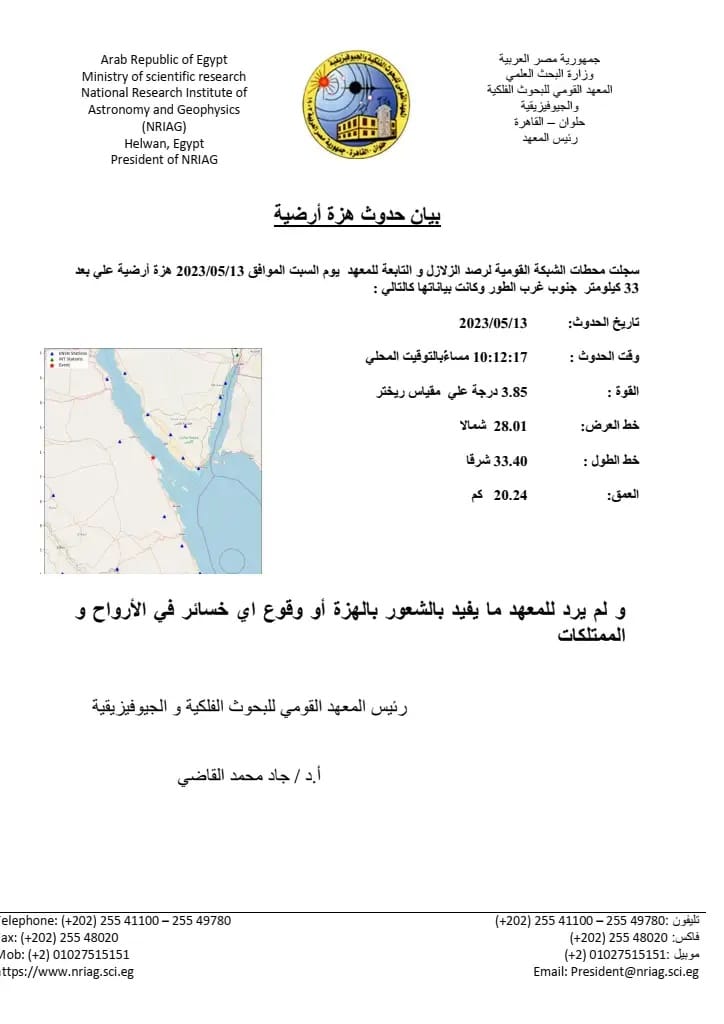 سجلت محطات الشبكة القومية لرصد الزلازل والتابعة للمعهد القومي للبحوث الفلكية والجيوفيزيقية، زلزالا بقوة 3.85 من مقياس ريختر على بعد 33 كيلو متر جنوب غرب الطور.