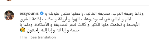 ونشرت إسعاد يونس صورة لـ الإذاعية صديقة حياتي، خلال حسابها الرسمي بموقع الصور والفيديوهات إنستجرام، معلقة: وداعًا رفيقة الدرب، صدّيقة الغالية، رافقتها سنين طويلة وأيام وليالي في استوديوهات الهوا وأروقة ومكاتب إذاعة الشرق الأوسط.