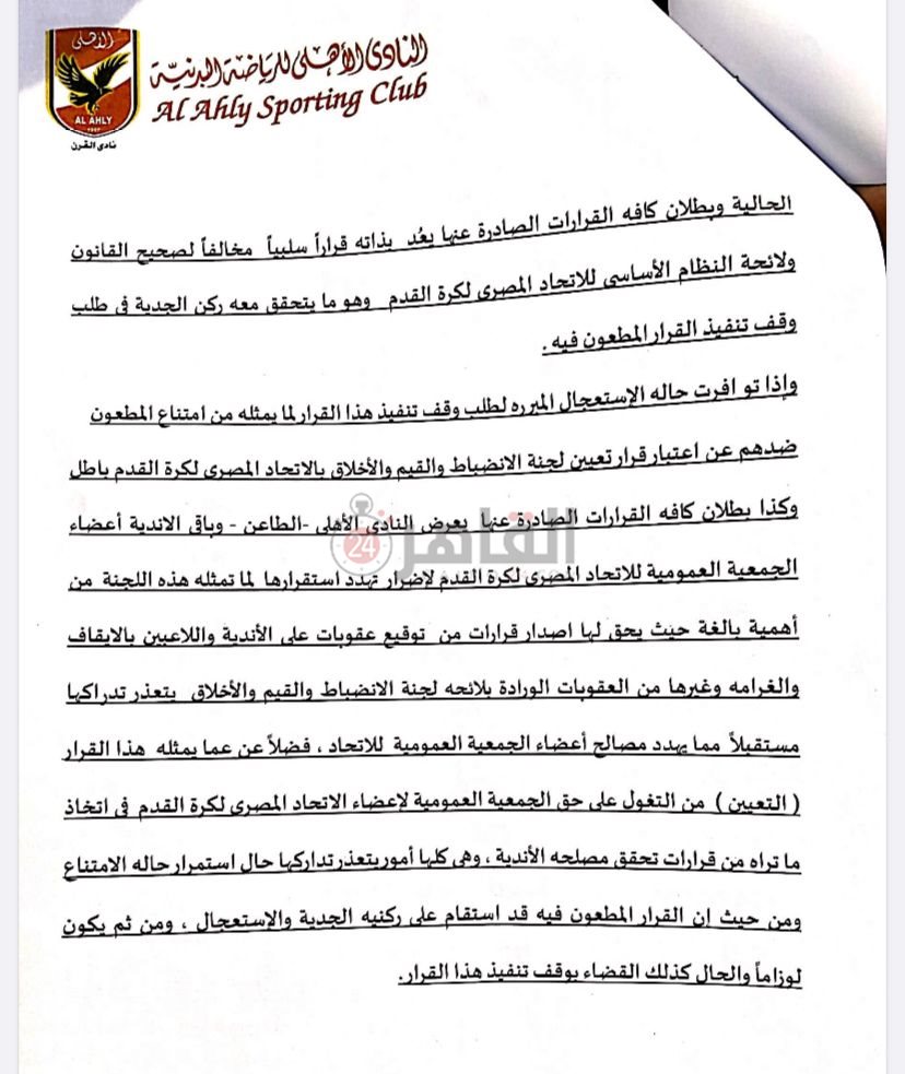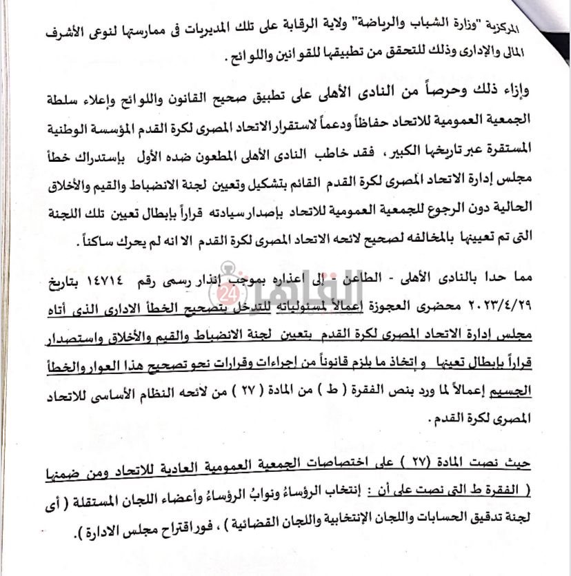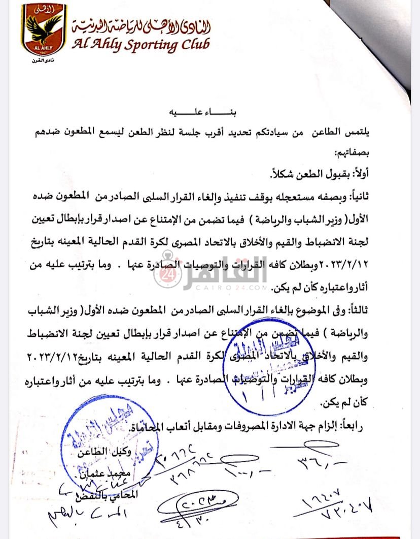 وكان المستشار محمد عثمان، المحامي بالنقض وكيلًا عن محمود الخطيب، رئيس مجلس إدارة النادي الأهلي، تقدم بدعوى قضائية خلال الساعات القليلة الماضية لحل لجنة الانضباط والقيم والأخلاق بالاتحاد المصري لكرة القدم، وذلك بعد إصدارها عقوبة في حق محمود كهربا لاعب الأهلي بالإيقاف 12 مباراة وتغريمه مليون جنيه.