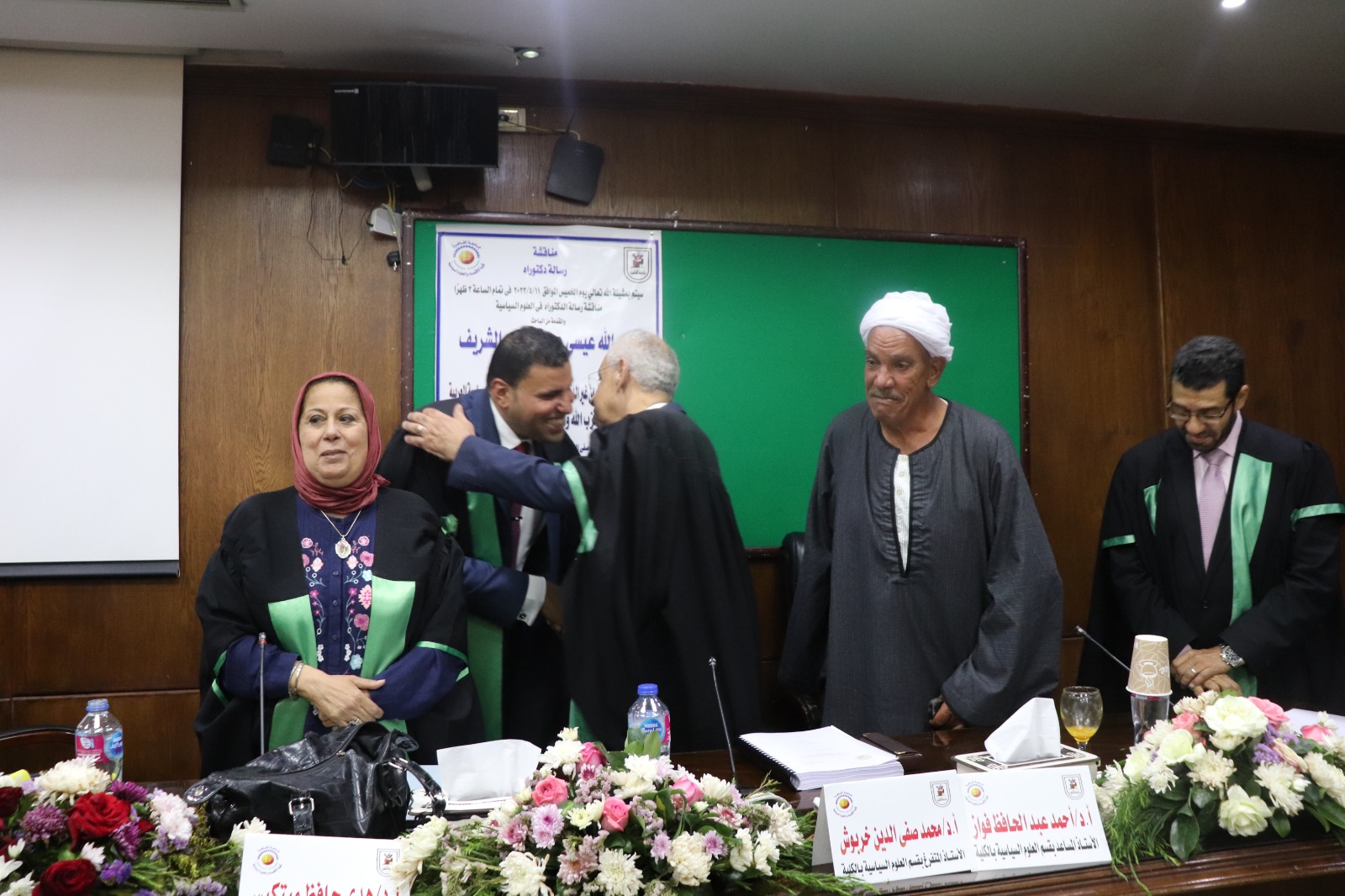أما لجنة المناقشة والحكم تكونت من الدكتورة هدى حافظ ميتكيس الأستاذ المتفرغ بقسم العلوم السياسية بكلية الاقتصاد والعلوم السياسية رئيسًا وعضوًا، والدكتورة أحلام محمد السعدي فرهود أستاذ العلوم السياسية بجامعة حلوان عضوًا.