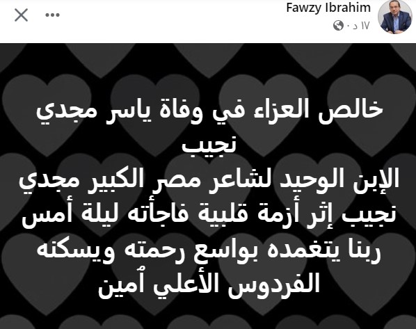 وكتب فوزي إبراهيم، منشورًا عبر حسابه الشخصي بموقع فيسبوك، جاء فيه: خالص العزاء في وفاة ياسر مجدي نجيب، الابن الوحيد لشاعر مصر الكبير مجدي نجيب، إثر تعرضه لأزمة قلبية مفاجئة ليلة أمس ربنا يتغمده بواسع رحمته ويسكنه الفردوس الأعلى أمين.
