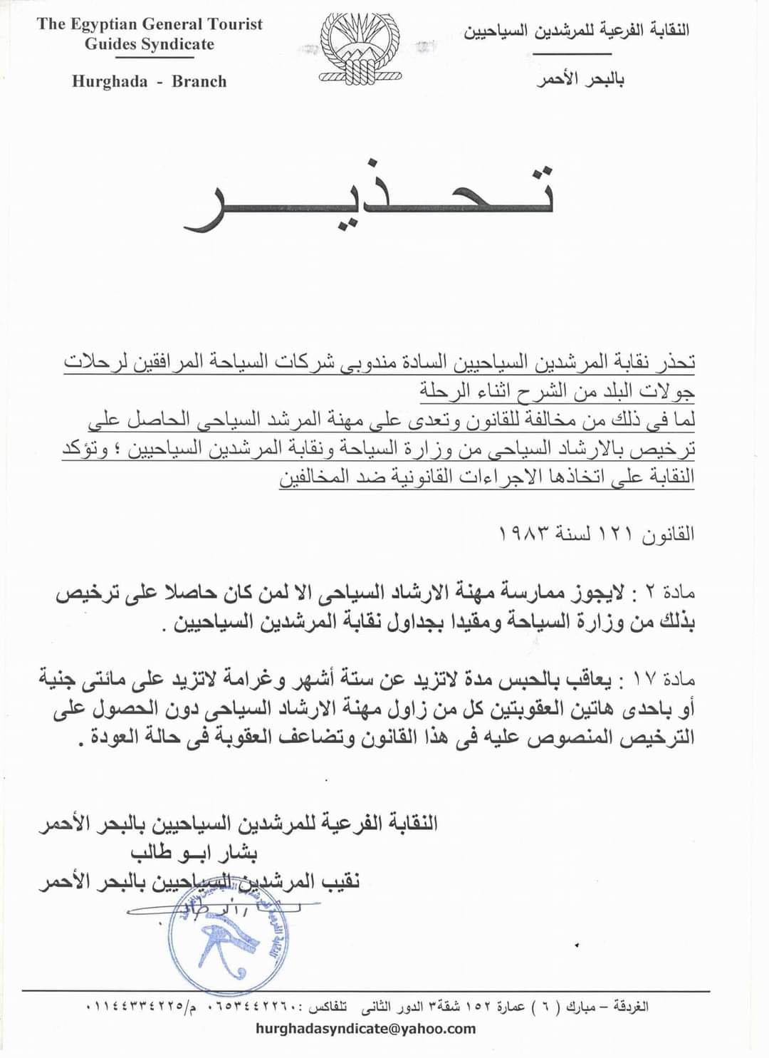 وأكد نقيب المرشدين السياحيين بالبحر الأحمر، أن المادة رقم 17 في القانون 121 لسنة 1983 أشارت للحبس مدة لا تزيد عن سنة وغرامة لا تزيد عن مائتي جنيه أو بإحدى هاتين العقوبتين كل من زاول مهنة الإرشاد السياحي دون الحصوص على الترخيص المنصوص عليه في القانون وتضاعف العقوبة في حال العودة.