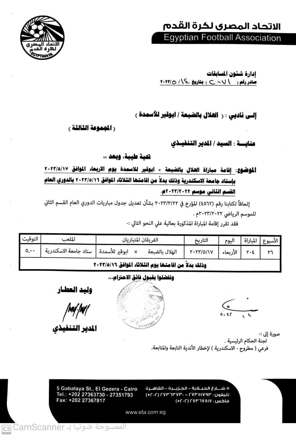 عدلت لجنة المسابقات بالاتحاد المصري لكرة القدم موعد مباراة الهلال المطروحي وبوقير للأسمدة، والتي من المقرر إقامتها الأربعاء الموافق 17 مايو، بدلًا من إقامتها يوم الثلاثاء 16 مايو.