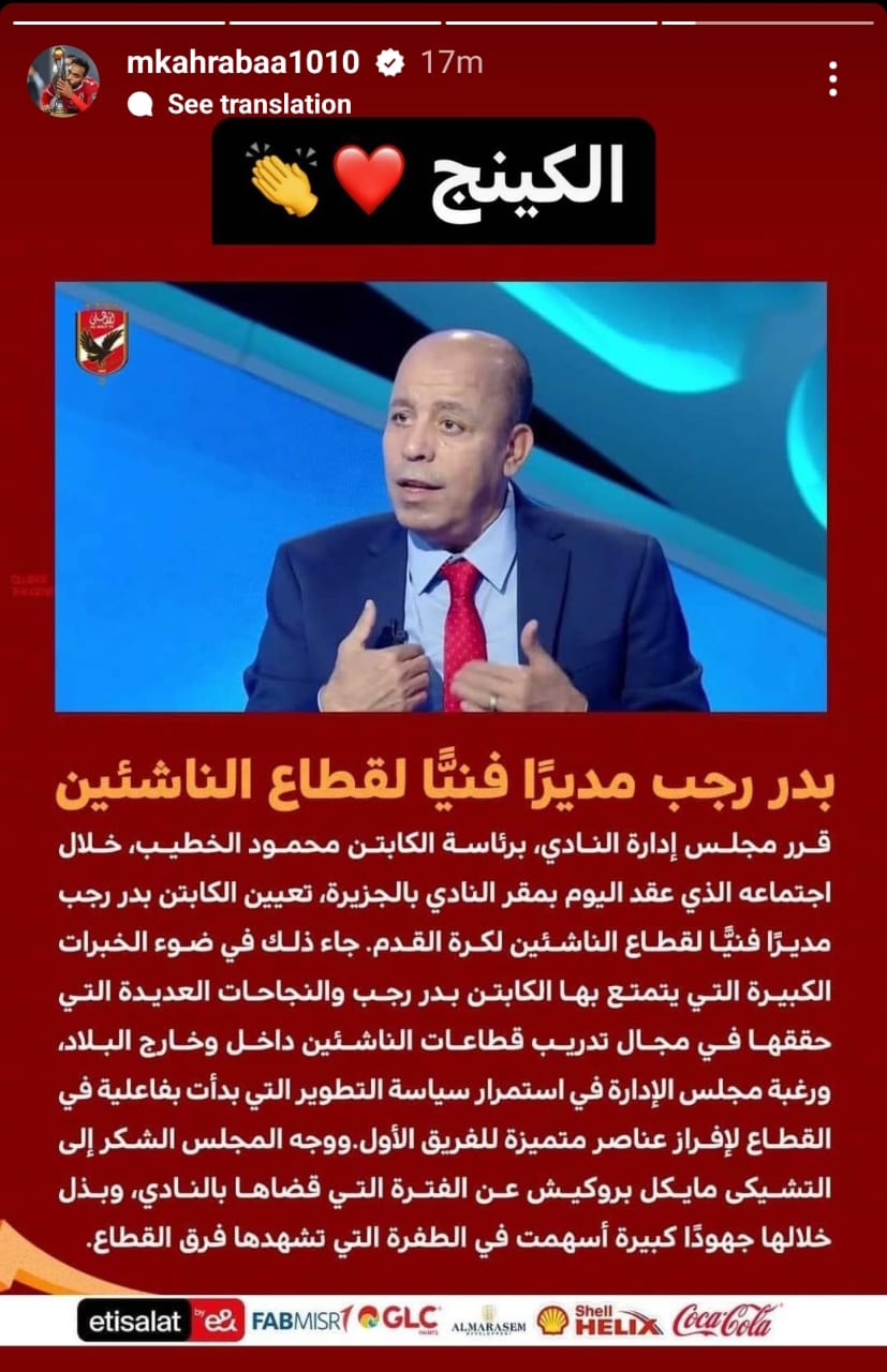 ونشر محمود كهربا، لاعب النادي الأهلي عبر إنستجرام، صورة للبيان الرسمي لتعيين بدر رجب، مديرًا فنيًا لقطاع الناشئين في الأهلي، وكتب عليها: الكينج.