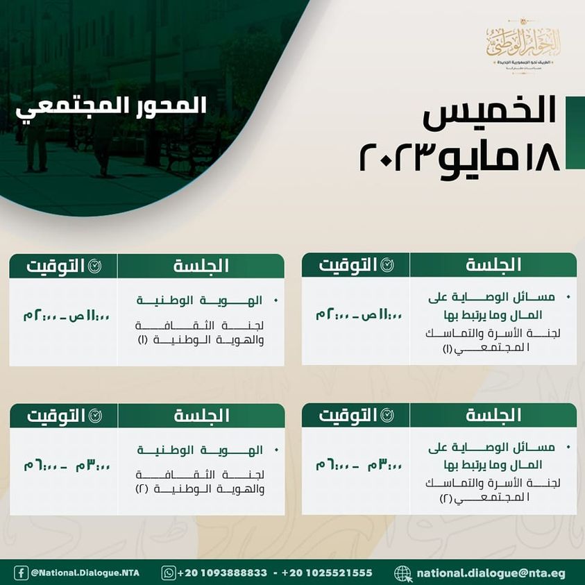 وفيما يلي تفاصيل وتوقيت جلسات المحور المجتمعي: