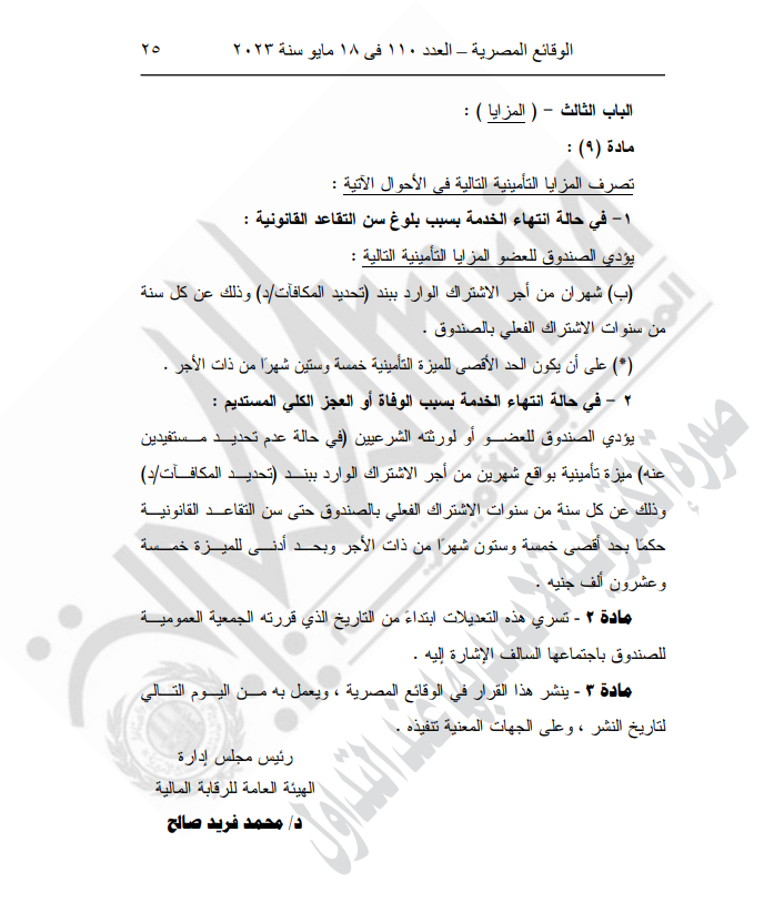 نشرت الجريدة الرسمية، قرار الهيئة العامة للرقابة المالية رقم 789 لسنة 2023 بتاريخ 19 مارس 2023، بشأن اعتماد تعديل لائحة النظام الأساسي لصندوق التأمين التكميلي للعاملين بالشركة العامة للصوامع.