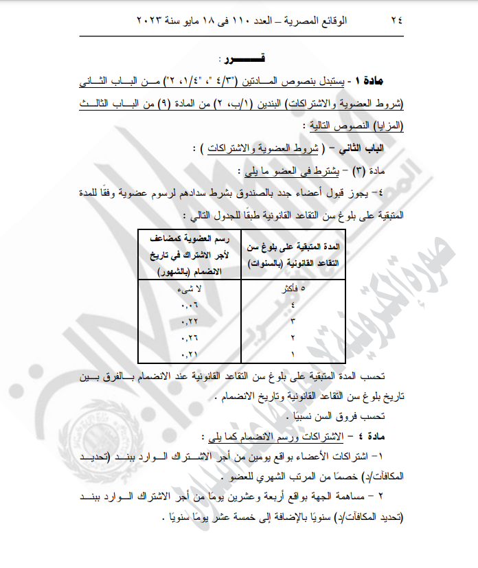 ونصت المادة الأولى من القرار، أن يستبدل بنصوص المـادتين (4/3، 2/1) مـن الباب الثـاني (شروط العضوية والاشتراكات ) البندين 1/ب،2) من المادة 9 من البـاب الثالـث ( المزايا) بالنصوص التالية من الباب الثاني والتي تتمثل في شروط العضوية والاشتراكات.