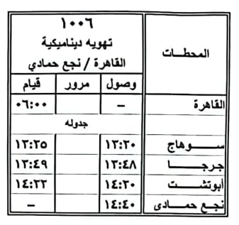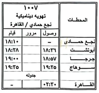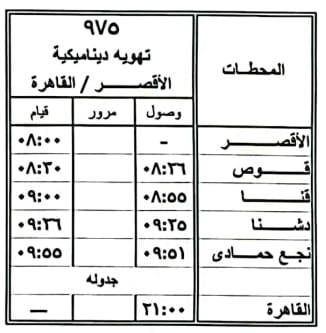 - اعتبارًا من يوم الأحد الموافق 21 مايو 2023 يتم قيام قطار 975 إكسبريس تهوية ديناميكية من محطة الأقصر بدلًا من محطة نجع حمادي طبقًا للجدول المرفق.