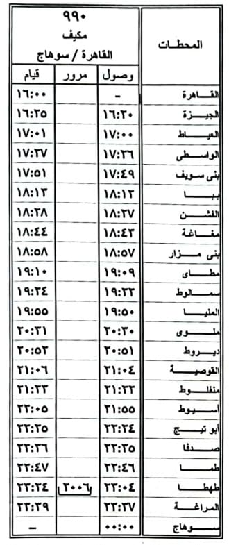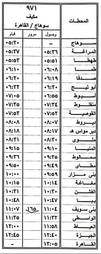 - اعتبارا من يوم الأربعاء 31 مايو 2023 يتم إيقاف تشغيل قطار 970 مكيف القاهرة / سوهاج بشكل مؤقت على أن يتم وقوف قطار 990 بالمحطات ( العياط – ببا – الفشن ) بالإضافة إلى جدوله الحالي كخدمة بديلة طبقا للجدول المرفق مع زيادة تركيبه.