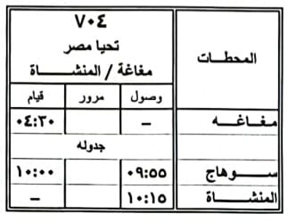 - اعتبارا من يوم السبت 20 مايو 2023 يتم امتداد مسير قطاري 704 / 703 ركاب مغاغة / سوهاج والعكس لمحطة المنشأة بدلًا من انتهاءه بمحطة سوهاج طبقًا للجدول المرفق.