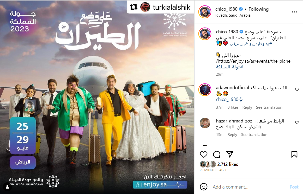ونشر شيكو البوستر الرسمي للمسرحية عبر حسابه بموقع إنستجرام، وعلق قائلا: مسرحية «على وضع الطيران» على مسرح محمد العلي في بوليفارد رياض سيتي.