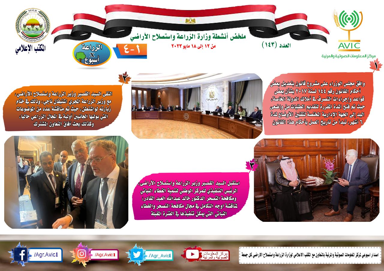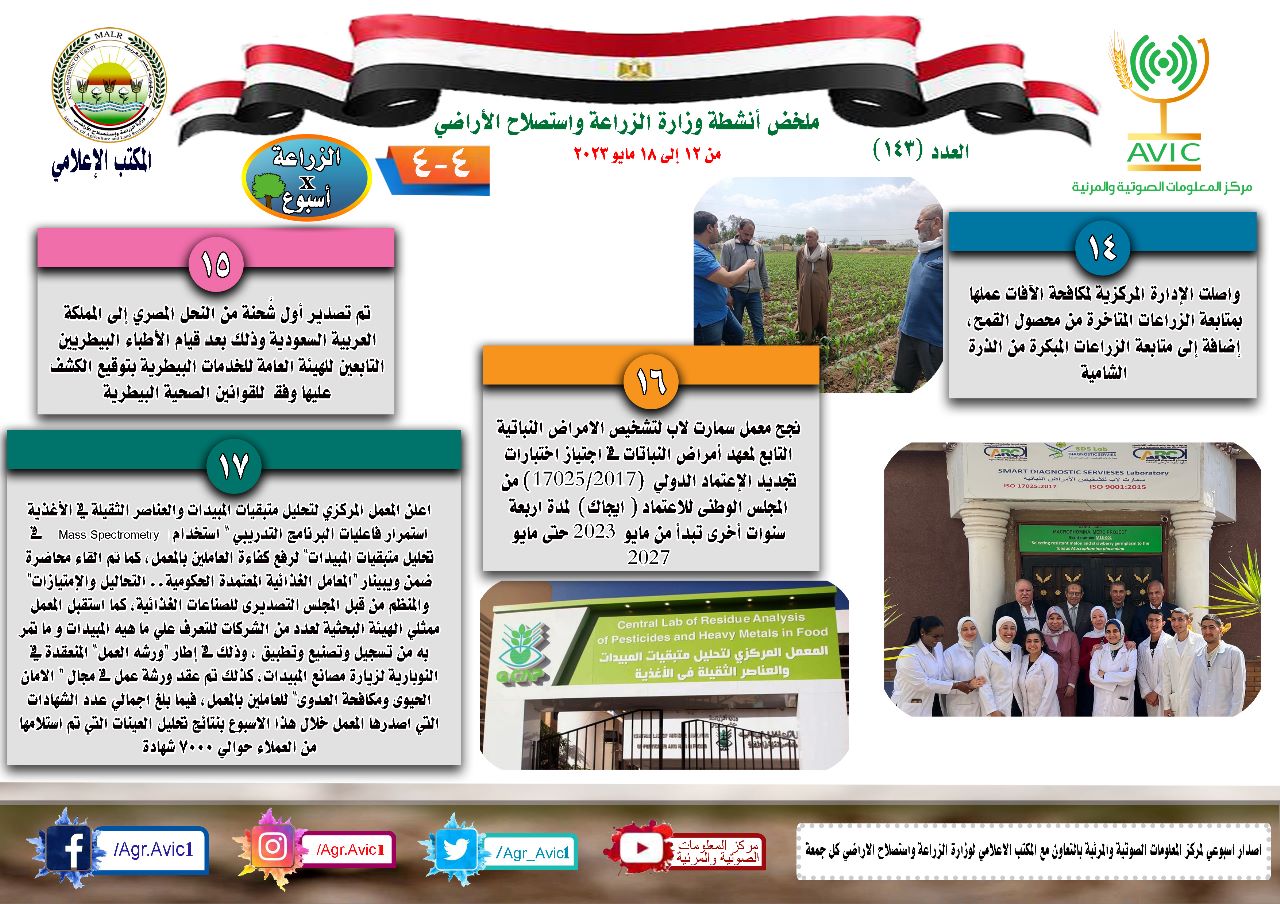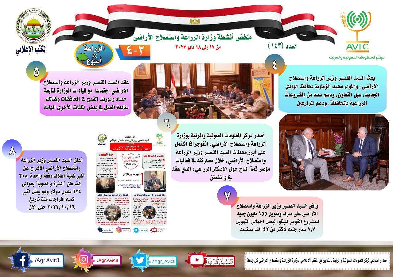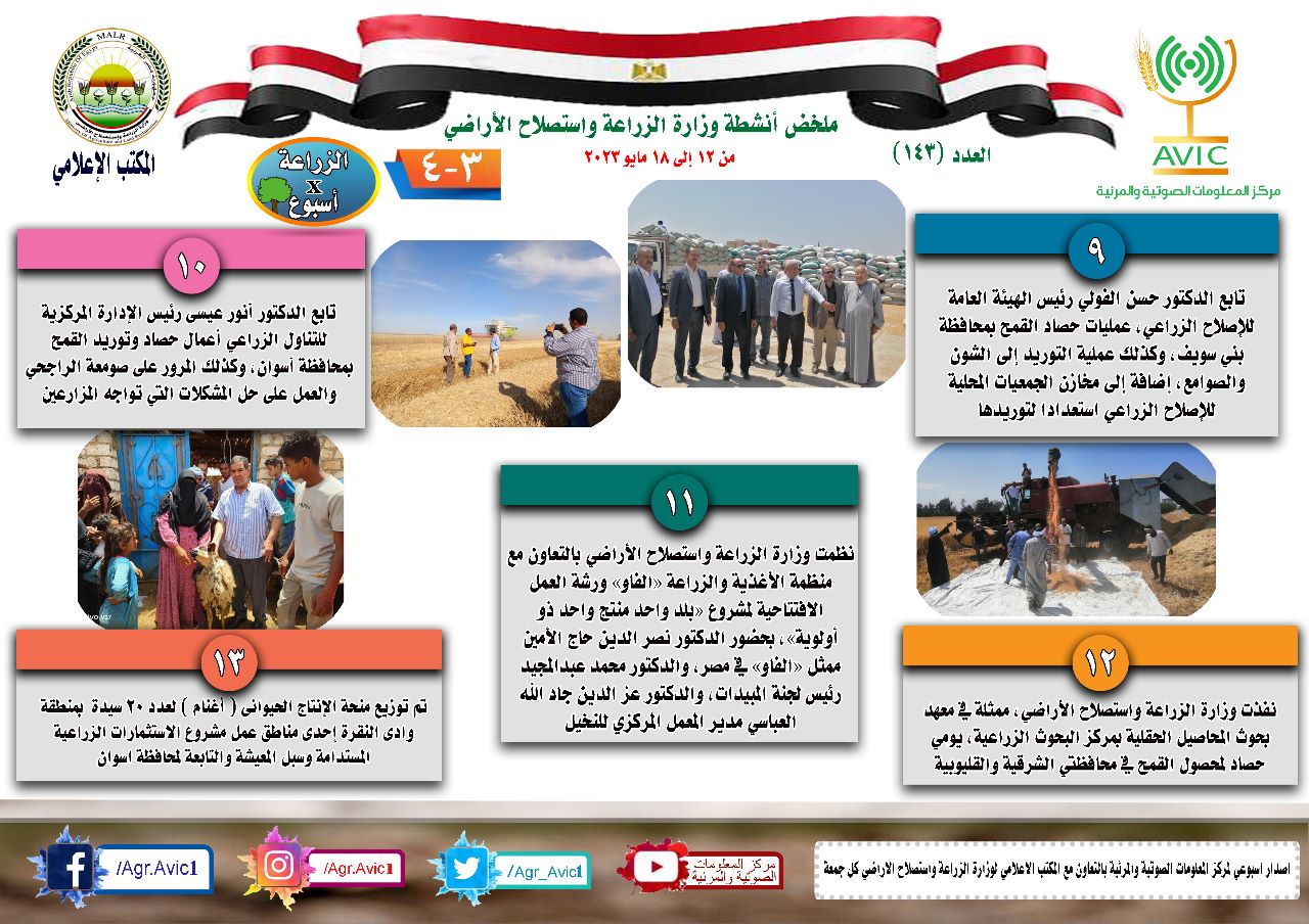 أصدر مركز المعلومات الصوتية والمرئية، التابع لوزارة الزراعة واستصلاح الأراضي، الإنفوجراف الأسبوعي في نسخته رقم 143، حول الحصاد الأسبوعي لأهم أنشطة الوزارة، خلال الأسبوع الماضي في الفترة من 12 إلى 18 مايو الجاري، بالتعاون مع المكتب الإعلامي للوزارة.