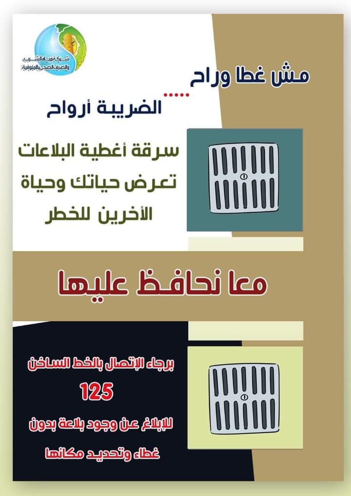 أطلقت شركة مياه الشرب والصرف الصحي بالمنوفية مبادرة تحمل شعار مش غطا وراح الضريبة أرواح، للإبلاغ عن سرقة أغطية بالوعات الصرف الصحي بجميع أنحاء المحافظة.