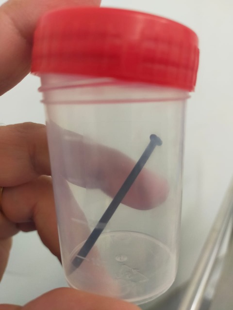 وكشفت الفحوصات التي أجراها الأطباء للطفل، عن توقف جسم غريب معدني مسمار 10 سم داخل الإثنى عشر وجدار المعده للطفل إثر ابتلاعه له.