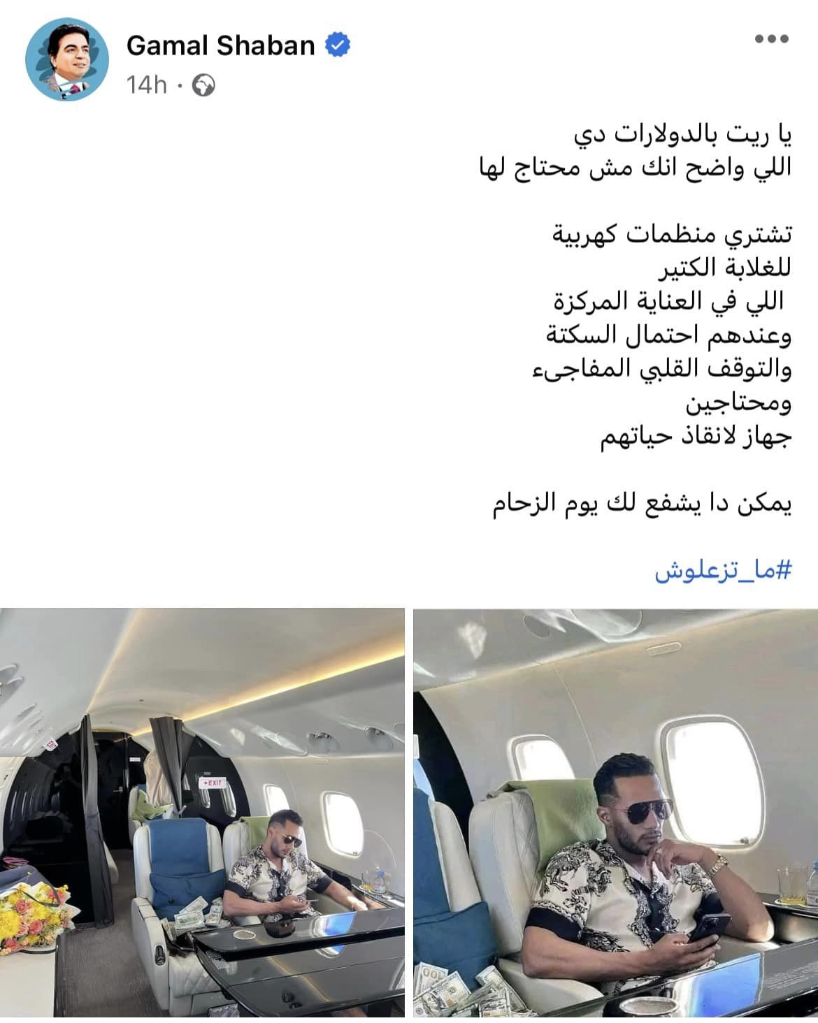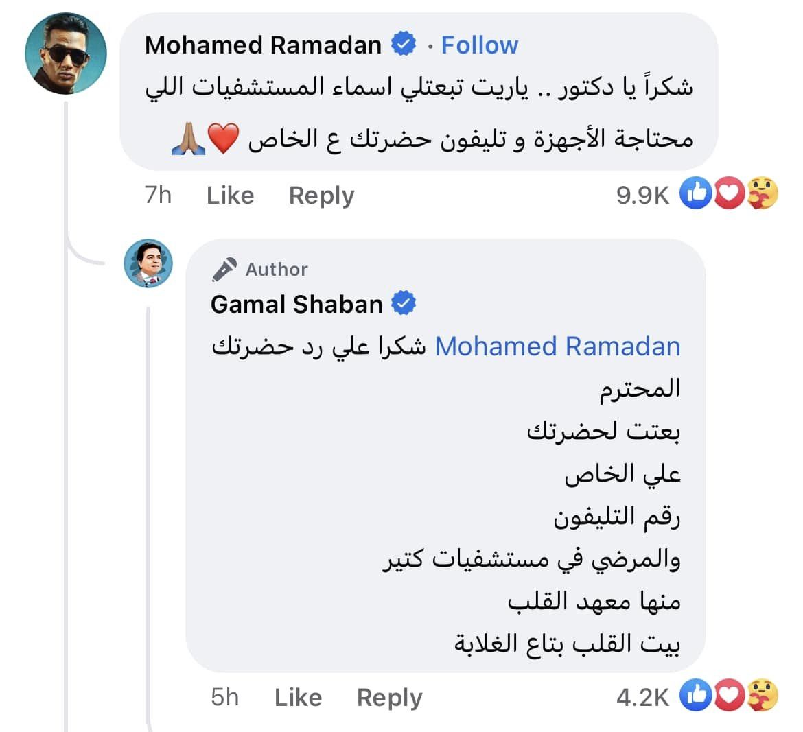 وكان الدكتور جمال شعبان عميد القلب السابق، انتقد الفنان محمد رمضان على حسابه بـ فيس بوك، قائلا: يا ريت بالدولارات دي اللي واضح أنك مش محتاج لها، تشتري منظمات كهربية للغلابة الكتير اللي في العناية المركزة، وعندهم احتمال السكتة والتوقف القلبي المفاجئ، ومحتاجين جهاز لإنقاذ حياتهم، يمكن ده يشفع لك يوم الزحام، وذلك تعليقًا على صور محمد رمضان مع الدولارات، ورد عليه محمد رمضان قائلًا: شكرا يا دكتور.. يا ريت تبعتلي أسماء المستشفيات اللي محتاجة الأجهزة، وتليفون حضرتك على الخاص.