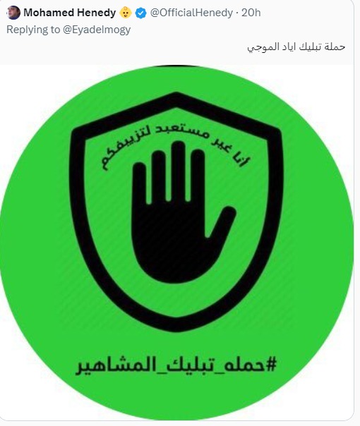 ليتدخل الفنان محمد هنيدي في حل هذا الشجار بطريقة كوميدية، حيث غرد: حملة تبليك إياد الموجي، وأوضح أنه يمزح معه في تغريدة أخرى..ثم بعدها غرد بتويتة أخرى لكنزي مدبولي قال فيها: خليكي فريش احنا في رحلة، هو نفسه وصحابه اتريقوا عليا وعادي.