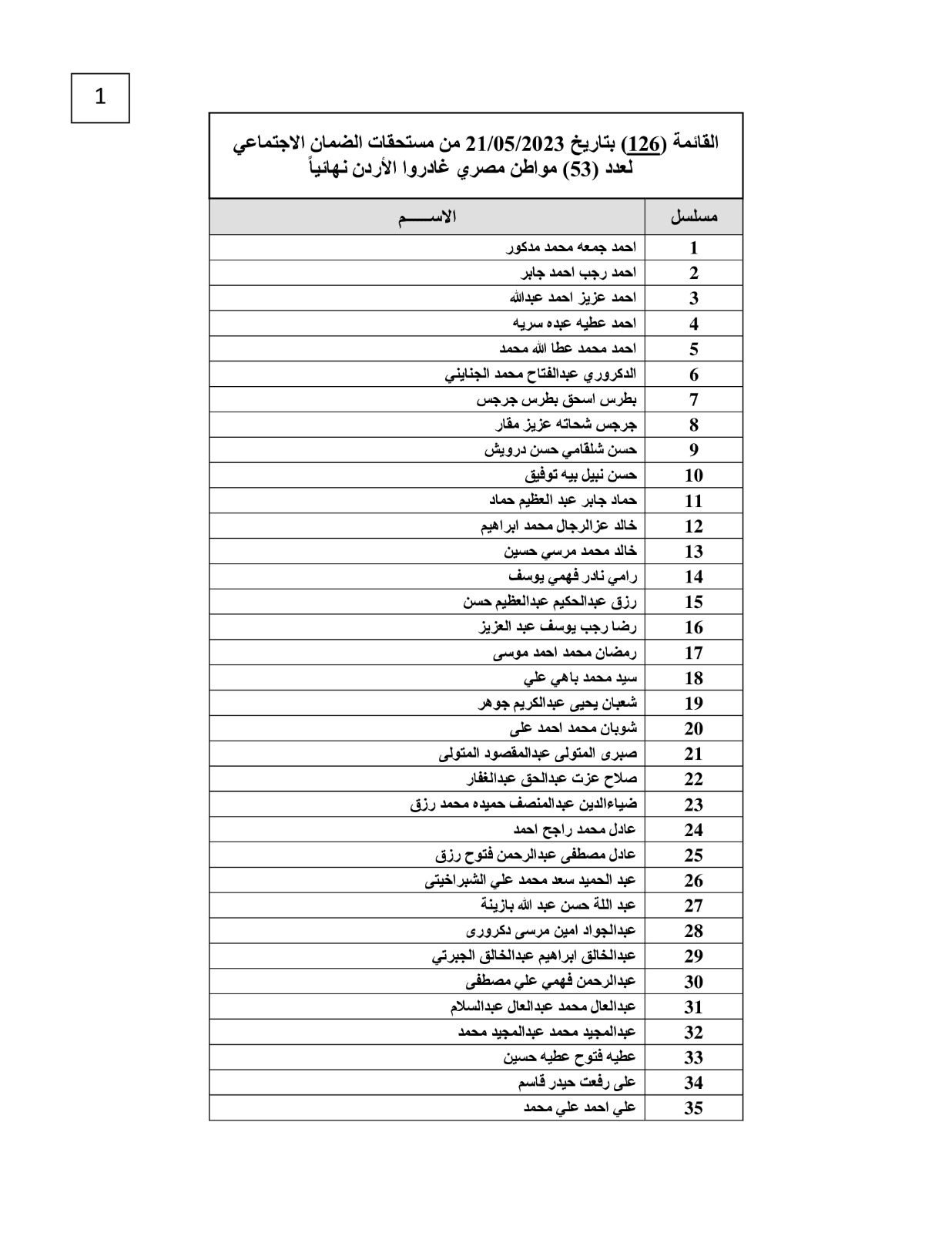أعلنت وزارة القوى العاملة أن مكتب التمثيل العمالي التابع للوزارة بالسفارة المصرية في العاصمة الأردنية عمان، تابع مع المسئولين بمؤسسة الضمان الاجتماعي بالأردن - استكمالا لما تم تحويله سابقا- عملية تحويل القائمة الـ126 من مستحقات الضمان الاجتماعي لنحو 53 عاملًا مصريًا لدى المؤسسة غادروا عمان نهائيا.