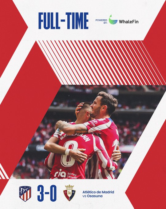 تمكن فريق أتلتيكو مدريد من الفوز على نظيره أوساسونا، بثلاثة أهداف مقابل لا شيء، في المباراة التي جمعت بينهما منذ قليل، ضمن منافسات الجولة الخامسة والثلاثين من مسابقة الدوري الإسباني الممتاز، على ملعب واندا ميتروبوليتانو.