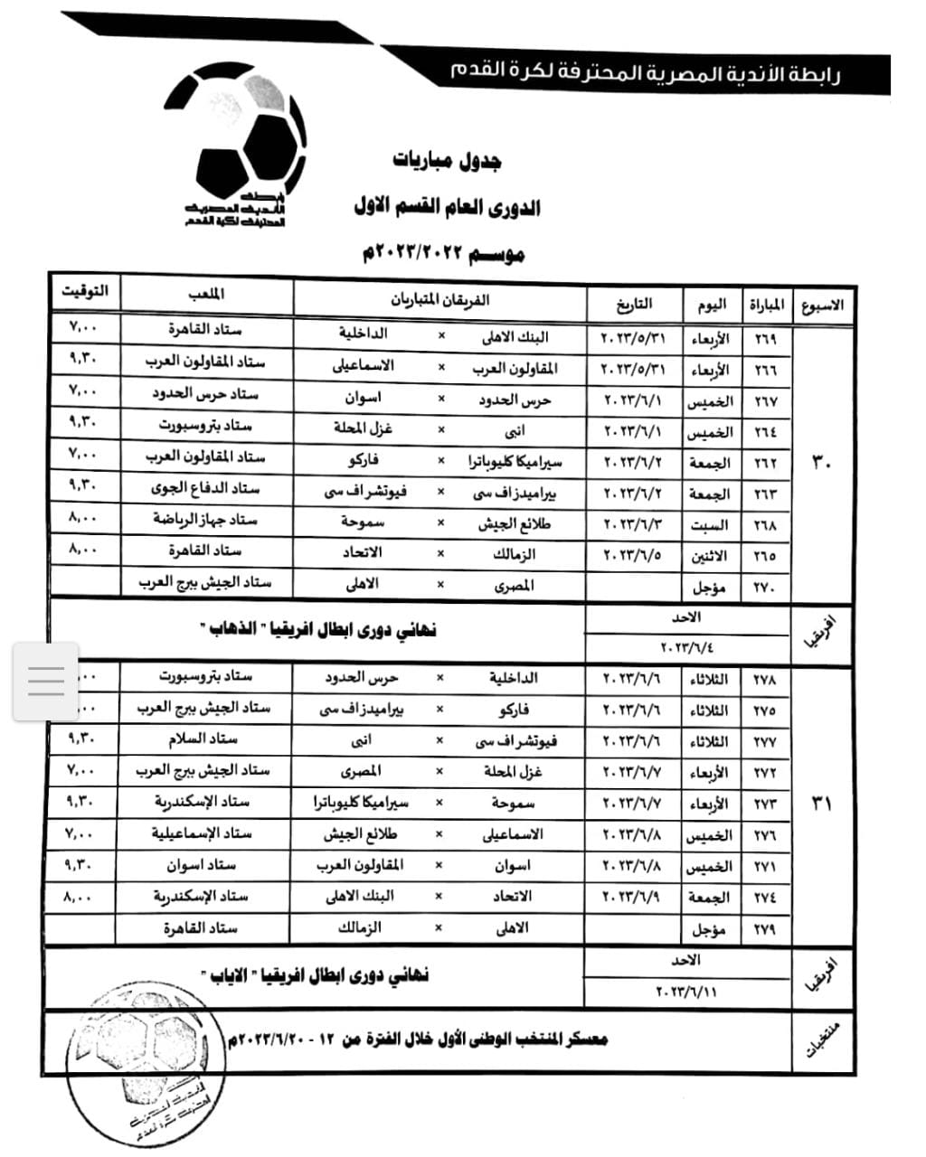فيما تقام مباريات الجولة الـ 31 من 6 حتى 9 يونيو، مع تأجيل مباراة القمة بين الأهلي والزمالك، لارتباط المارد الأحمر بخوض إياب نهائي دوري أبطال إفريقيا.