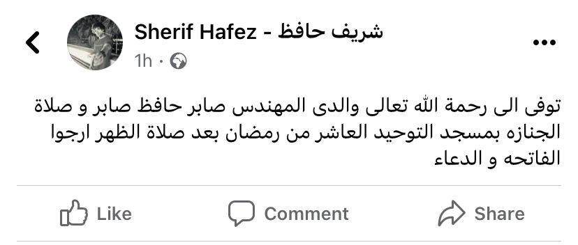 وكتب شريف حافظ، منشورًا عبر حسابه الشخصي بموقع التواصل الاجتماعي فيسبوك، حيث قال: توفى الى رحمة الله تعالى والدي المهندس صابر حافظ صابر، وصلاة الجنازة بمسجد التوحيد العاشر من رمضان بعد صلاة الظهر أرجو الفاتحة والدعاء.