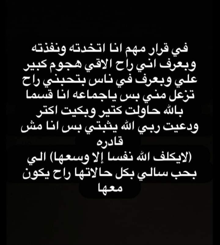 قالت سالي العوضي في فيديو: فيه قرار مهم أنا اتخذته ونفذته، وأعرف أني سأتلقى هجوما كبيرا عليّ، وأعرف إن فيه ناس بتحبني راح تزعل مني، بس يا جماعة أنا قسمًا بالله حاولت كثير وبكيت أكثر ودعيت ربي إنه يثبتني بس أنا مش قادرة.