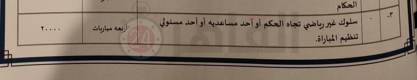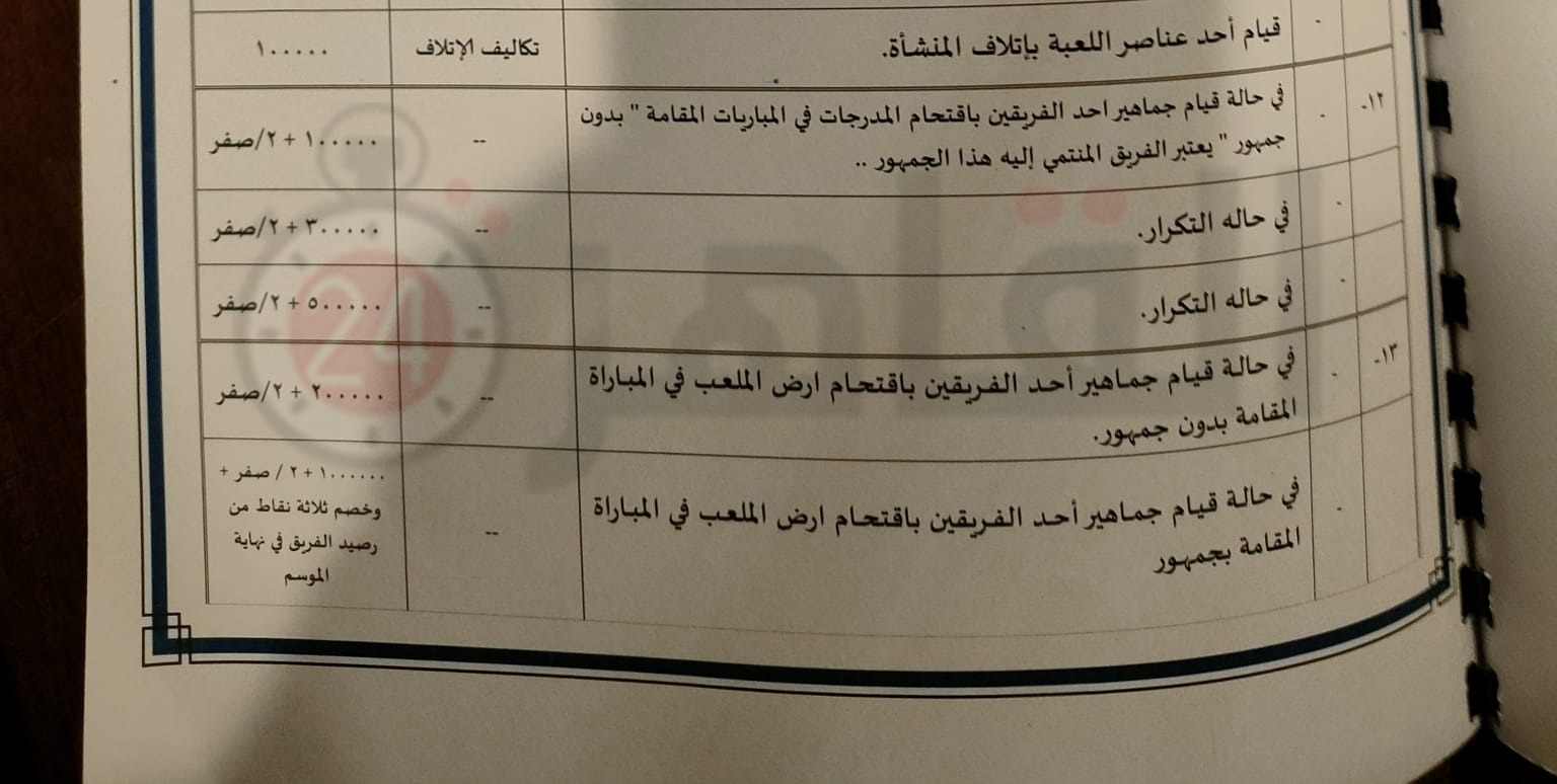 ولكن علم القاهرة 24 أن الغرامة المالية ستكون أكبر بسبب التلفيات استنادًا للبند في اللائحة والذي ينص على قيام أحد عناصر اللعبة بإتلاف المنشأة غرامة 100 ألف جنيه بجانب تكاليف الإتلاف.